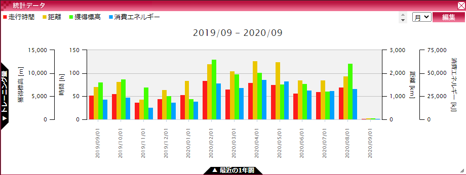 最近は夜練で毎日宮ヶ瀬を走っているからなのか、獲得標高が他の月よりも多め。
